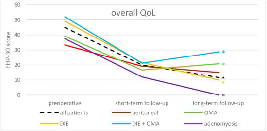 Results of EHP-30 overall QoL of the whole study population and divided by the endometriosis subtypes at the three time points. * = significant improvement between preoperative and long-term follow-up (p-value < 0.05). QoL, quality of life; OMA, endometrioma; DIE, deep-infiltrating endometriosis.