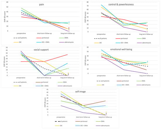 The subgroups of DIE (p < 0.001) or adenomyosis (p < 0.033) demonstrated significant improvements in all EHP-30 scales comparing preoperative with long-term follow-up results.