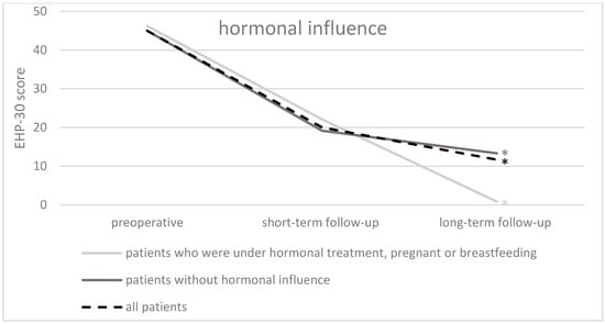 Results of EHP-30 overall QoL of the whole study population (n = 87) and divided by hormonal influence and without hormonal influence at the three time points. * = significant improvement between preoperative and long-term follow-up (p-value < 0.05).
