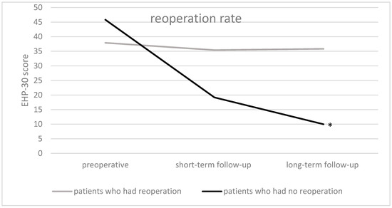 Results of EHP-30 overall QoL of the whole study population (n = 87) by need of reoperation at the three time points. * = significant improvement between preoperative and long-term follow-up (p-value < 0.05).