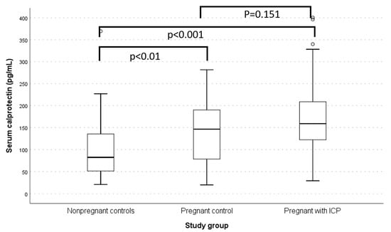 Box plot showing the difference in the serum calprotectin levels between the non-pregnant controls, pregnant women without ICP, and pregnant women with ICP.