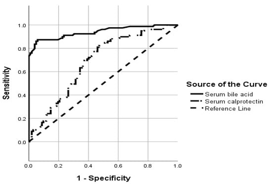 Categorical and continuous variables were expressed as ratio/proportions and median (interquartile range). Intergroup comparison was done using Chi2 and Wilcoxon’s rank-sum test and STATA software (Stata Statistical Software: Release 16; version 16.1, StataCorp LLC, College Station, TX, USA). The diagnostic performance of the serum BA and serum calprotectin was assessed with the receiver operating curve (ROC). p value < 0.05 was considered significant.