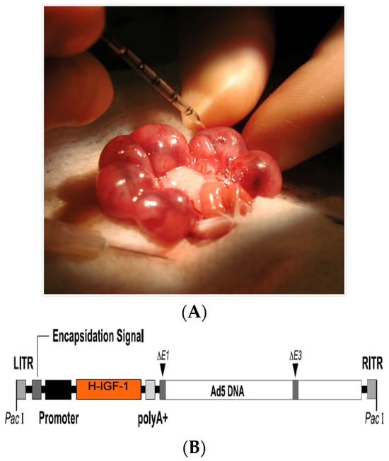 (A) Direct placental injection of Ad-5-hIGF-1 vector in the MUAL mouse model on e18 using a Hamilton syringe. (B) Construct of adenovirus-5 vector containing hIGF-1 gene used in placental gene therapy.