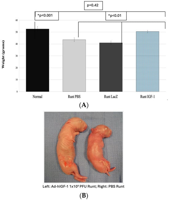 (A) Correction of fetal growth restriction in naturally occurring rabbit model of FGR using Ad-hIGF-1. (B) Gross specimen for comparison in pup weight between ad-hIGF-1 runt vs. PBS in rabbit runt model, * = significant.