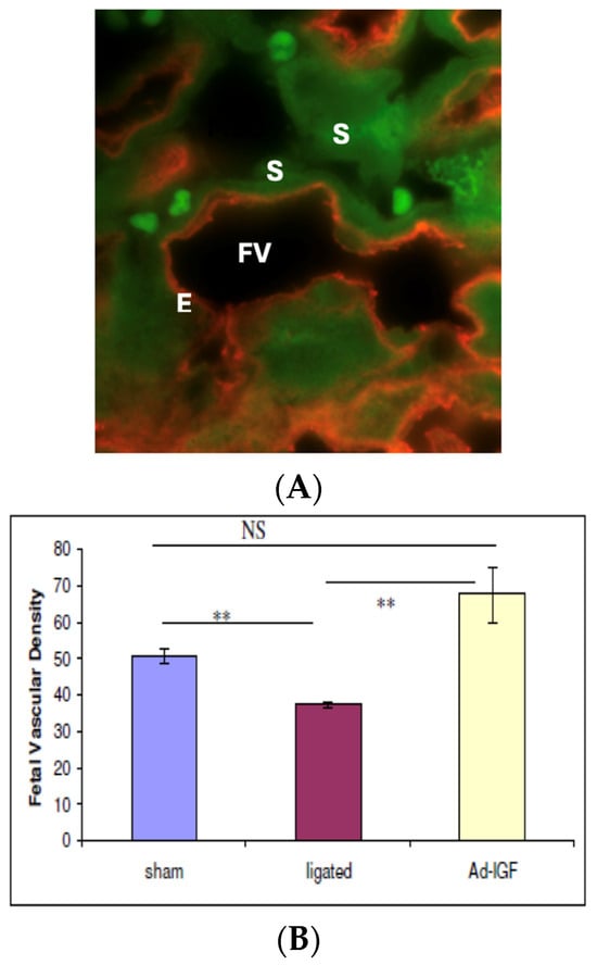 (A) High-power merged confocal image of placental tissue with fetal vessel (FV) section immunostained for fetal endothelial cells (E) (red) and syncytiotrophoblasts (S) (green), used for quantifying vascular density. (B) Effect of mesenteric uterine artery ligation (MUAL) and IGF-1 gene transfer on fetal microvascular density., NS = non-significant, ** = significant.