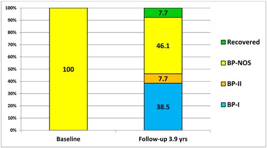 We included 72 patients, with a median age (interquartile range: IQR) at the time of BP diagnosis of 13.6 (9.6–15.7) years. Diagnostic stability was 95.8% after a median (IQR) follow-up time of 3.9 (1.8–5.9) years. At baseline, 37.5% of the sample had BP-I, 8.3% BP-II, and 54.2% BP-NOS. At the endpoint, 62.5% had BP-I, 8.3% BP-II, 25% BP-NOS, and 4.2% of patients no longer met criteria for BP. The % of BP-II was 8.3% both at baseline and at the endpoint, but they were not the same patients. Three (7.7%) converted from BP-II to BP-I and three (7.7%) BP-NOS converted to BP-II, so the number of BP-II remained unchanged, but they were different patients.