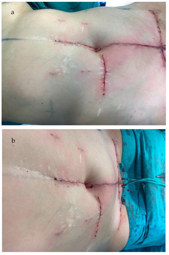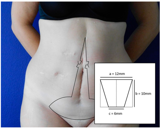 The ideal shape and position of the umbilicus has been discussed extensively in the literature. The perfect umbilicus is found to be modest in size, T-shaped, or vertically shaped with a superior hood [5]. The ideal location of the umbilicus appears to be “low-riding”, meaning that the distance from the xiphoid process to the umbilicus is greater than the distance from the umbilicus to the pubic symphysis [6,7]. However, re-insertion of the umbilicus is planned based on anthropometric landmarks such as the xiphoid process, the lower limit of the vulvar cleft, the superior iliac spine, and the height of the waistline. Interestingly, Rohrich et al. found that, in most cases, the natural umbilicus is not located exactly in the midline [8].