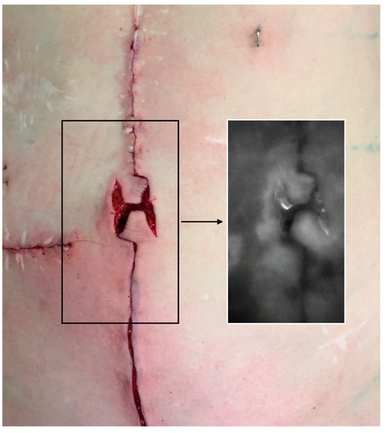 As is standard in our department when performing abdominal wall reconstruction with tissue resection, we routinely performed indocyanine green (ICG) fluoroscopy. Analysis was conducted after closure of the midline and localized subcutaneous defatting. Topographic perfusion analysis was performed after intravenous injection of 25 mg indocyanine green (ICG-Pulsion® 5 mg/mL, PULSION Medical Systems SE, Feldkirchen, Germany), using the handheld IC-FlowTM device (Diagnostic Green LLC, Farmington Hills, MI, USA) (Figure 5).