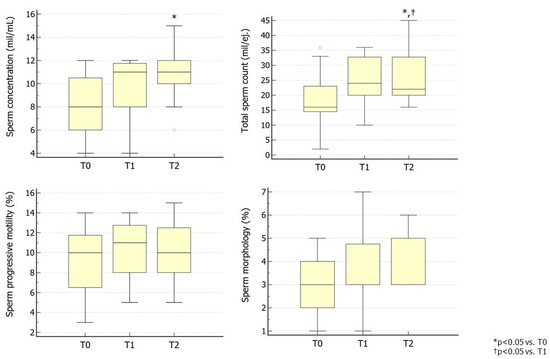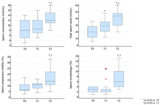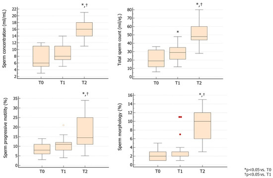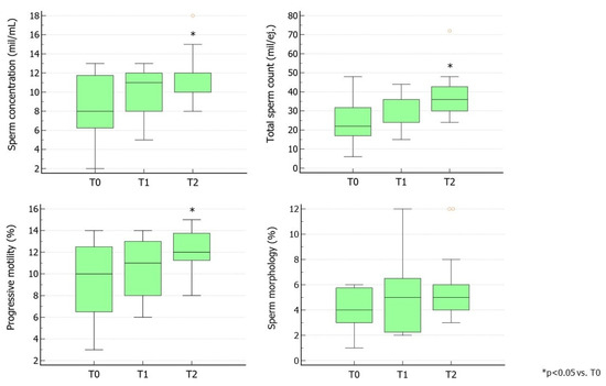 All parameters were assessed at baseline (T0), after the first three months of treatment (T1), and at the end of the second cycle of treatment. They included sperm concentration, total sperm count (TSC), sperm motility, sperm morphology, semen volume, number of patients achieving spontaneous pregnancy, TV, and serum levels of LH, FSH and TT. Age and body mass index (BMI) values were also collected.