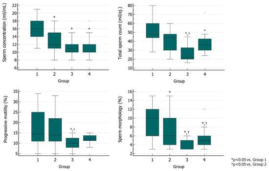 At T2, Group 1 benefited most from the therapy in terms of amelioration of conventional sperm parameters. The sperm concentration in Groups 2, 3, and 4 was significantly lower than in Group 1. TSC was significantly lower in Groups 3 and 4 than in Group 1. Group 3 had also significantly lower values than Group 2, while no differences were found between Groups 1 and 2. Group 3 showed a significantly lower progressive motility than Groups 1 and 2. Groups 3 and 4 had worse morphology than Groups 1 and 2, while Group 2 had lower morphology than Group 1 (Figure 5).