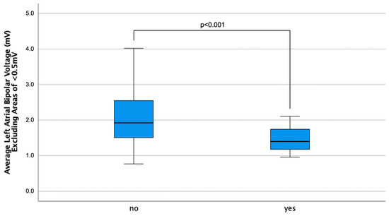 A representative study investigated the prevalence and predictors of low-voltage areas in patients presenting for AF ablation [18]. Similar to our study, bipolar voltage mapping was performed and zones with bipolar voltage of <0.5 mV were defined as low-voltage areas. The authors found an overall incidence of patients with low-voltage areas of 35%, which is lower than the proportion of 52% of patients with low-voltage areas of our study population. An explanation for this difference can be found in the baseline characteristics of the different study populations. For example, the mean CHADSVASc score, which also serves as a predictor for the existence of low-voltage areas [11], of their study population was 2.3, compared to 2.6 of our collective. Another well-known predictor for low-voltage areas is LA enlargement and increased LA surface area [18,19]. The median LA surface area of their study population was 103 cm2, which was significantly lower than the 133 cm2 of our study collective.
