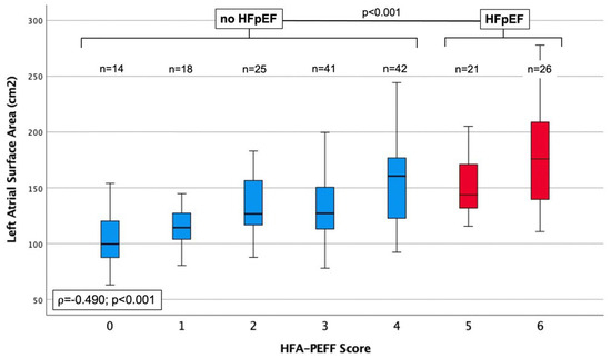 Boxplots displaying the left atrial surface area, according to ascending values of the HFA-PEFF score.