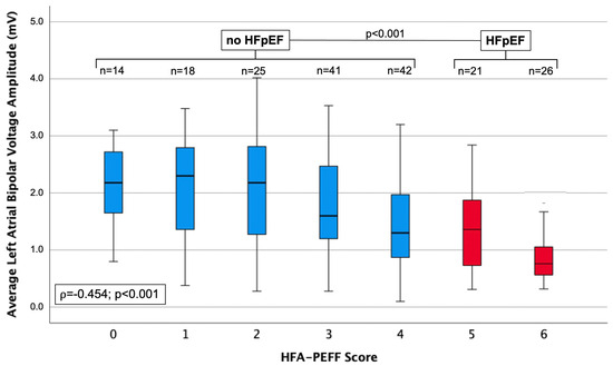 Boxplots displaying the average left atrial bipolar voltage amplitude, according to ascending values of the HFA-PEFF score.