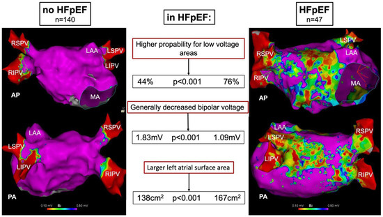 To date, there have been no data on the extent of fibrotic and arrhythmogenic LA remodeling in HFpEF patients undergoing AF ablation. The aim of this study was to elucidate the interference between HFpEF, AF, and low-voltage areas (LVAs) in patients presenting for first AF ablation. Therefore, we performed extensive LA bipolar voltage mapping to detect areas of low voltage, a widely accepted surrogate for fibrotic changes in HFpEF vs. non-HFpEF patients presenting for AF ablation [14].