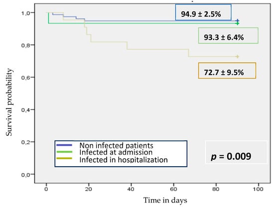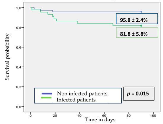 The 90-day survival was higher in noninfected patients (71) than in infected patients (44) (95.8 ± 2.4% vs. 81.8 ± 5.8%, p = 0.015; Figure 1). In-hospital infected patients exhibited worse survival (72.7 ± 9.5%) than did those infected upon admission (93.3 ± 6.4%) or noninfected patients (94.9 ± 2.5%) (p = 0.009; Figure 2).