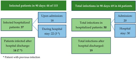 From hospital discharge to the end of follow-up, 19 infections developed in 14 patients (13.2% of 106 living patients), among whom 7 had a previous infection (6 patients had a pre-existing infection upon admission, and 1 developed an infection during hospitalization). The complete information on the 90-day study period is shown in Scheme 1.