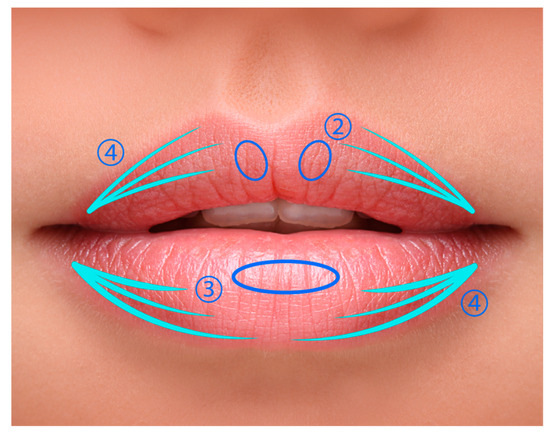 The distribution of HA dermal filler volume in the lips: (1) 0.1–0.2 cc per side; (2) 0.05–0.1 cc per side; (3) 0.1–0.2 cc total; and (4) 0.01 cc per line, shown in light blue. This figure was personally designed by the authors to accurately represent the procedure described.