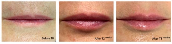 Between June 2022 and October 2022, a total of 13 subjects (all Caucasian and women), with an average age of 55.3 ± 8.3 years (range of 42–69 years) had lip enhancement using a dermal HA filler. An average of 1.15 cc of HA was injected per patient (range of 1–2 cc). The representative cases are presented in Figure 2 and Figure 3. It is important to note that not all patients attended the follow-up visits at 3 months (8 out of 13 patients) and 6 months (5 out of 13 patients).
