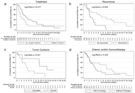 Overall survival (OS) analysis. (a). OS curves for all patients with curative surgical or palliative treatment (p = 0.077). (b). OS curves for patients with curative surgical treatment who had a recurrence and who did not have a recurrence (p = 0.009); (c). OS curves for patients with curative surgical treatment whose tumor contours were either spiculated or smooth (p = 0.037); (d). OS curves for patients with curative surgical treatment with and without additional chemo- and/or immunotherapy (p = 0.325).