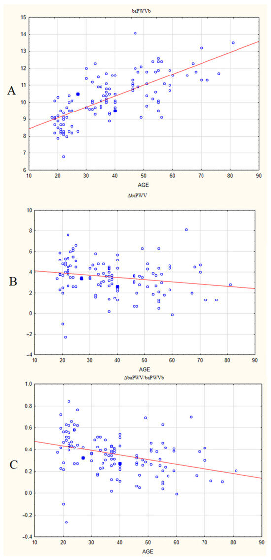 Linear regression graphs between age (independent variable) and different indices of vascular stiffness in healthy individuals: basal PWV, baPWVb (A), increase in baPWB after tilt, ΔbaPWV (B), and relative increase in baPWV after tilt, ΔbaPWV/baPWVb (C). Legend: Horizontal axis: age, years. Vertical axis: baPWVb, m/s (A), ΔbaPWV, m/s (B) and ΔbaPWV/baPWVb (C). Red line—regression line in linear model of regression.