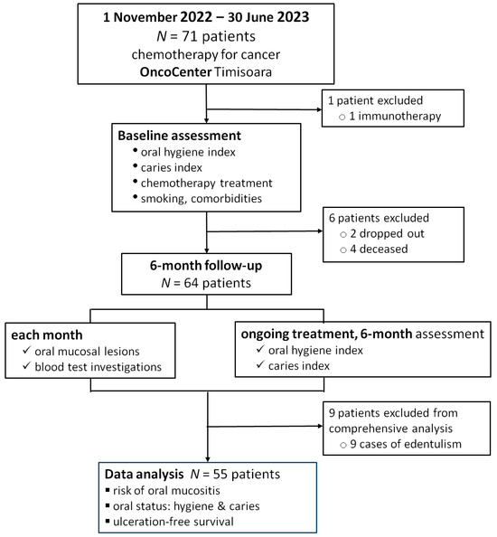 We conducted a prospective, longitudinal study. The initial study group consisted of 71 consecutive patients diagnosed with cancer (other than head and neck cancer) and admitted for chemotherapy at Oncocenter, a private oncology clinic in the Western part of Romania, between 1 November 2022 and 30 June 2023. The follow-up period was six months. Figure 1 shows the study flowchart.