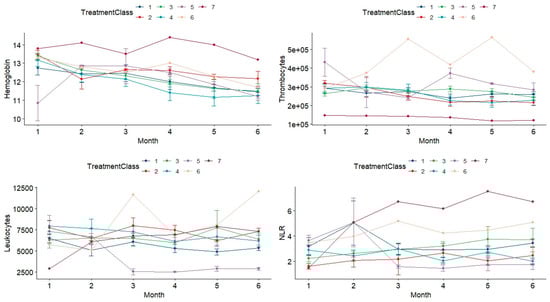Results of monthly laboratory tests during chemotherapy treatment. High variability is apparent across the seven treatment classes.