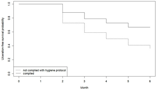 This analysis included 55 non-edentulous patients. Table 9 synthesizes the ulceration-free survival analysis taking into account the self-reported compliance with the recommended hygiene protocol, and Figure 3 shows the Kaplan–Meier curves.