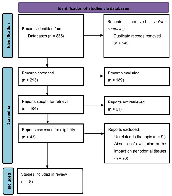 The keyword entry yielded about 835 abstracts. A total of 43 articles were initially confirmed as eligible for systematic review and were analyzed in detail. Ultimately, eight articles were selected. The full selection process is shown in Figure 1.