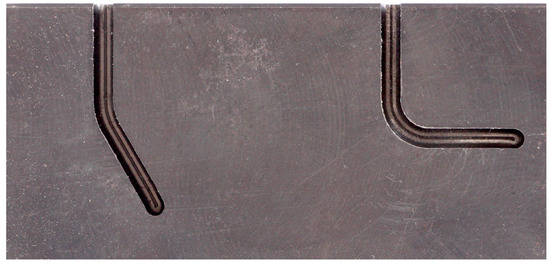 A metal template was made to test the files’ resistance to cyclic fatigue without interfering with the canal walls during rotation. This template featured two canals milled on its surface. The methods used to prepare the metal template and assess the files’ resistance were previously described in studies by Gambarini et al. [22], Al-Sudani et al. [32], and Whipple et al. [33]. To make the template, a 60 mm high, 40 mm wide, and 20 mm deep metal block made of X155 steel was constructed using computer-aided design in collaboration with a precision micro-milling center. Two curved canals were milled in the metal block, as shown in Figure 1. The canals have the following characteristics: Canal 1: curvature angle, 60°; curvature radius, 5 mm; canal length, 25 mm; canal diameter, 2 mm; milling depth, 3 mm; and Canal 2: curvature angle, 90°; curvature radius, 3 mm; canal length, 25 mm; canal diameter, 2 mm; milling depth, 3 mm.