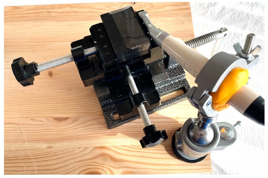 The steel template was milled to an accuracy of ± 0.001 mm and then tempered at a temperature above 1000 °C to achieve a hardness index of 61 ± 2 HRC. X155 steel is a high-performance, wear-resistant material widely used to produce industrial machine-cutting tools. The hardening process further increases the wear resistance. The material used to create the template was not affected by the continuous rotation of the Ni-Ti files, thus preserving the original geometry of the root canals. The endodontic motor was secured to the metal template using bench vises to ensure reliable results, allowing transverse movement. The bench vises were attached to a wooden table, and the endodontic motor was affixed to the bench using a vise equipped with a ball connector (Figure 2).