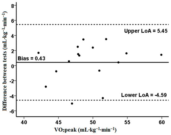 Typically, in similar studies [16,17,18,19,20,21,22], the VO2peak between the incremental exercise test and verification test was compared as a group mean. Noakes [43] criticized this approach, stating that the verification of the VO2peak against that measured in an IET should be considered as an individual response. The use of the arithmetic mean for all participants in statistical analyses may not identify the individual variability in the VO2peak measurement between these tests. Our study confirms this statement, as the mean difference in the VO2peak between the IETRAMP and VER85 was only 0.8% and was not significant. The coefficient of variation for VO2peak was 3.1% and was close to the most commonly used CV measures, which assume differences of 2–3% [29,44]. In other studies, some authors have utilized less restrictive criteria of ≤5–5.5% for the acceptable differentiation of measurements of physiological response [45,46]. Moreover, Villanueva et al. [19] reported a more significant agreement between the peak VO2 obtained in the incremental exercise test and the submaximal verification test (85% IET peak power) compared to the supramaximal test (110% IET peak power), which was analyzed by examining the limits of agreement and bias presented in Bland–Altman plots. Similarly, this is confirmed by the Bland–Altman analysis carried out in our study, which indicates the existence of a high agreement between the verification phase and the ramp test for VO2max, evaluating with one outlier. Although the need for the verification test seems questionable according to some researchers, additional tests prove helpful in assessing the individual variability in VO2peak [21]. Murias et al. [16] concluded that performing an additional verification test may allow for measuring a higher VO2peak value, which, for some reason, cannot be achieved during the IET. This is consistent with our results, because the highest VO2peak (including both tests) was 1% higher than that measured only during the IETRAMP (50.3 vs. 49.5 mL·kg–1·min–1). Thus, this justifies conducting a test to verify the VO2max measured in an IET, as previously postulated by Poole and Jones [10].