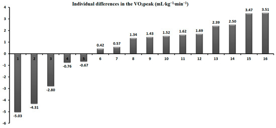Table 2 shows that the peak oxygen uptake did not show significant differences between the tests (p = 0.51). During the VER85, the VCO2 was significantly lower (p < 0.05, t = 2.20, ES = 0.34), similar to HRmax (p < 0.05, t = 2.36, ES = 0.23). The CV was 3.1%, and the Bland–Altman analysis revealed a high agreement and a small bias for the VO2peak (0.43). One outlier was identified outside the lower limits of agreement (−4.59) (Figure 2). Moreover, five participants (31%) achieved a higher value during the VER85 (Figure 3). The peak oxygen uptake for the group that obtained it in the IETRAMP (n = 11) was 51.1 ± 4.8 mL kg–1 min–1 (95% CI 47.8–54.3), and in the verification test (n = 5), it was 48.8 ± 3.9 mL kg–1 min–1 (95% CI 43.9–53.7) (p = 0.50).