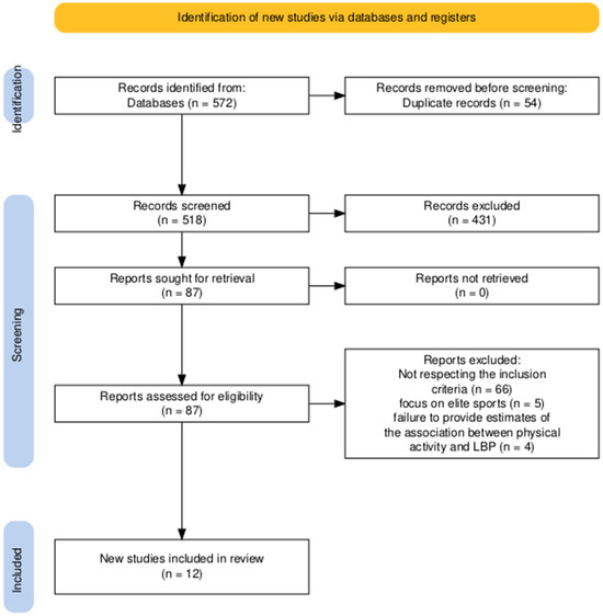 The initial database search identified 572 articles. After removing 54 duplicates, 518 articles remained. The titles and abstracts of these articles were screened, resulting in the exclusion of 431 articles that did not meet the inclusion criteria. The full texts of the remaining 87 articles were assessed for eligibility. Of these, 75 articles were excluded for the following reasons: lack of information on physical activity (7 articles), focus on elite sports (5 articles), and failure to provide estimates of the association between physical activity and LBP (4 articles). Consequently, 12 studies met the inclusion criteria and were included in the final analysis. The PRISMA flow diagram illustrates the study selection process (Figure 1).