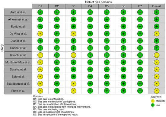 The risk of bias across the included studies was assessed using the ROBINS-I tool. The studies varied in methodological rigor, with five studies classified as having a low risk of bias and seven categorized as having a moderate risk of bias. The primary sources of bias identified were related to confounding and participant selection.