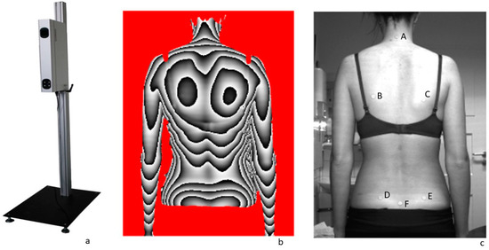 (a) MiniRot Combi back scanner (ABW GmbH, Frickenhausen/Germany), (b) three-dimensional phase picture of the back, (c) illustration of the exact marker position on the back: A: vertebra prominens (7th cervical vertebra), B: left lower scapular angle, C: right lower scapular angle, D: left spina iliaca posterior superior (SIPS), E: right spina iliaca posterior superior (SIPS), F: sacrum point (cranial beginning of the gluteal cleft).