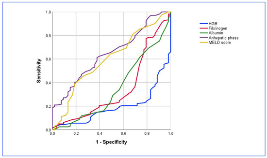 The ROC curve analyses can be summarized as follows: cut-off values for blood HGB ≤ 11.5 (AUC: 0.800; sensitivity: 73.6%; specificity: 82.1%; 95% CI: 0.74–0.85; p < 0.001), albumin ≤3.6 (AUC: 0.663; sensitivity: 83.4%; specificity: 56.4%; 95% CI: 0.60–0.73; p = 0.0002), and fibrinogen ≤125 (AUC: 0.638; sensitivity: 68.7%; specificity: 62.5%; 95% CI: 0.57–0.70; p = 0.0024) and a cut-off anhepatic phase value >53 min (AUC: 0.651; sensitivity: 61.3%; specificity: 62.5%; 95% CI: 0.58–0.71; p = 0.0002).