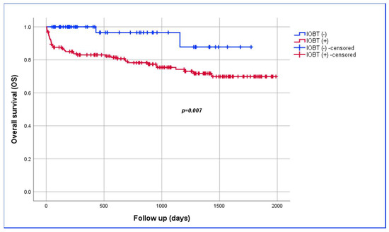 Kaplan–Meier survival estimate of overall survival analysis among patients with or without IOBT.