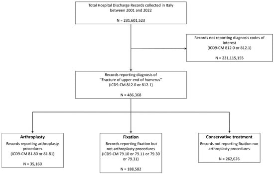 HDRs for the years from 2001 to 2022 were browsed, and only those records where at least one ICD9-CM code for diagnoses with the first four digits equal to 812.0 (Fracture of upper end of humerus closed) or 812.1 (Fracture of upper end of humerus open) appeared in one or more field of main or secondary diagnosis were selected. Records were then divided into three groups, based on ICD9-CM codes appearing in any of the main or secondary procedure fields, according to the procedure performed during hospitalization. If the code 81.80 (Total shoulder replacement) or 81.81 (Partial shoulder replacement) appeared, the patients were considered as treated via “Arthroplasty”. If the code 79.10 (Closed reduction of fracture with internal fixation), or 79.11 (Closed reduction of humeral fracture with internal fixation), or 79.30 (Open reduction of fracture with internal fixation), or 79.31 (Open reduction of humeral fracture with internal fixation) appeared, the patient was considered as treated with internal “Fixation”. If none of the above-mentioned codes appeared, the performed treatment was considered as “Conservative”.