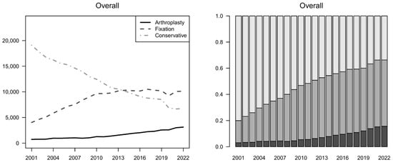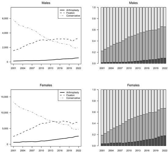 Trends by treatment group (2001–2022). Counts (left column) and proportions (right column), overall and by sex. Dark gray: arthroplasty; gray: fixation; light gray: conservative.