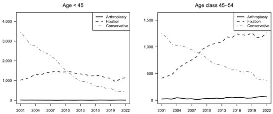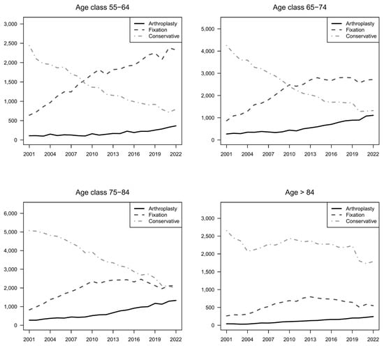 The age class analysis highlighted that the increase in preference towards arthroplasty was stronger in age classes 65–74 and 75–84 (Figure 3 and Figure 4 and Supplementary Materials). In general, this approach increased only slightly and is usually avoided in the youngest and oldest patients.