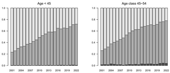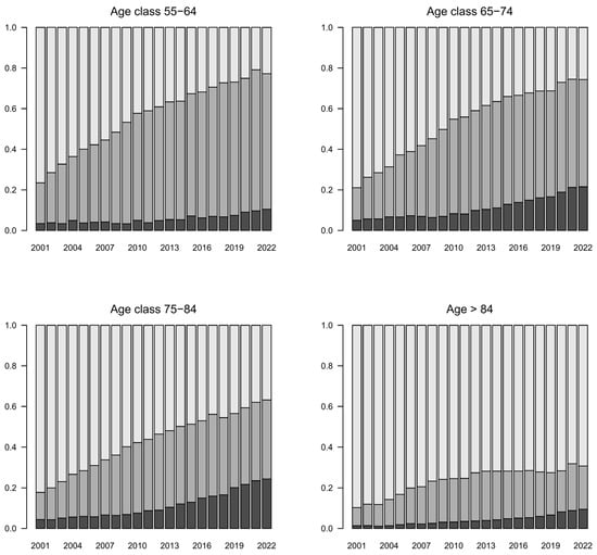 Trends by treatment group (2001–2022). Proportions by age class. Dark gray: arthroplasty; gray: fixation; light gray: conservative.