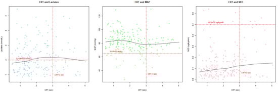 There was a very wide dispersion of CRT values for their corresponding MAP, NED and lactate concentrations (Figure 2). There was no correlation between CRT and MAP (r = −0.1, p = 0.14), and CRT and lactate (r = 0.11, p = 0.13), but there was a positive weak correlation between CRT and NED (r = 0.25, p = 0.0005).