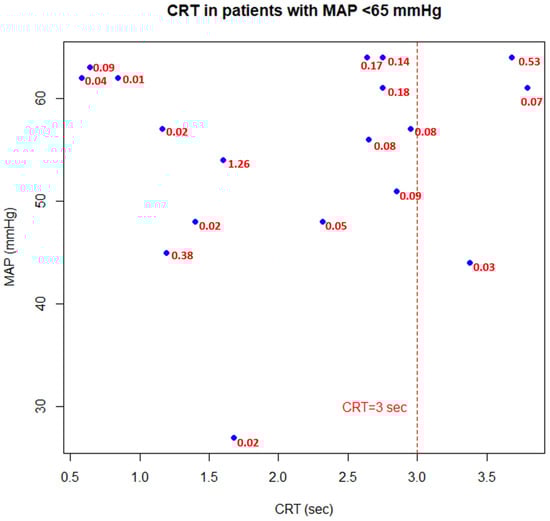Capillary refill time in patients with mean arterial pressure <65 mmHg (hypotension). Red values correspond to norepinephrine equivalent doses (ug/kg/min). CRT—capillary refill time; MAP—mean arterial pressure.