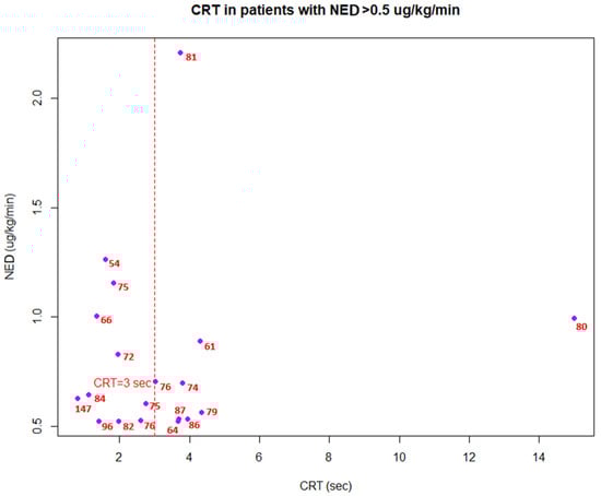 Capillary refill time in patients with norepinephrine equivalent doses >0.5 ug/kg/min (high catecholamine doses). Red values correspond to mean arterial pressure (mmHg). CRT—capillary refill time; NED—norepinephrine equivalent dose.