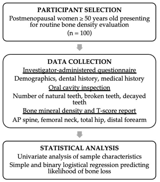 Following enrollment and informed consent, we gathered information on participants’ demographics, dental history, and medical history using an investigator-administered questionnaire (Appendix A). Although this questionnaire is not standardized, questions were adapted from standardized tools and previous research showing the validity of questionnaires to screen for PD []. Additional questions were formulated based on known predictors of OP and PD. This approach is very important in epidemiological research involving PD, given that not every patient has access to a formal dental evaluation. Height and weight were measured, and we inspected their oral cavities to count the number of teeth and to document the number of broken or decayed teeth present. Prior to beginning data collection, the study team was trained and calibrated on proper dental examination techniques by a dental expert (CG). This involved reviewing images and criteria required to define teeth as “normal”, “decayed”, “broken”, and “missing” based on physical inspection. Teeth were categorized as “broken” if any portion, but not the entire tooth, was missing. Tooth “decay” was defined as having discoloration or breakdown of tooth enamel on inspection. Teeth were categorized as “missing” if all parts of the tooth, including the root, were absent. Finally, teeth were categorized as “normal” if the above criteria were absent and the teeth appeared to be intact. All study assessments, including the bone density evaluation, periodontal evaluation, and questionnaire, were collected on the same day for each participant. Participant bone mineral density reports were obtained after interpretation by the radiologist, and bone mineral density and T-scores at the AP spine, femoral neck, total hip, or distal forearm were collected. Participants were classified either as having normal bone mineral density (BMD) or bone loss based on BMD in the osteopenia or osteoporotic range []. PD was defined as an affirmative response to any one of the following: history of gum disease, receipt of deep cleaning, loose teeth, tooth sensitivity, or gum bleeding on the questionnaire [,,]. The number of remaining teeth were categorized into ≥20 and <20 teeth as described by a previous study []. BMI was categorized using the standards provided by the Centers for Disease Control and Prevention (CDC) []. Figure 1 describes the eligibility criteria, data collection, and statistical approach.