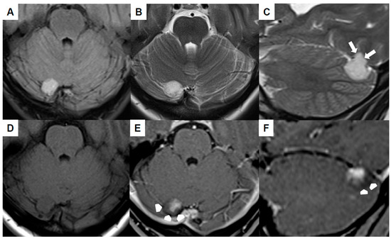 Brain MRI (Figure 1A–F) revealed the mass to be homogeneously hyperintense in the fluid-attenuated inversion recovery (FLAIR) as well as T2-weighted sequences and cortex-isointense in the unenhanced T1-weighted sequence. The well-defined lesion displayed no perifocal edema, yet it likely demonstrated infiltration into the tentorium (white arrows in Figure 1C). The differentiation between a primary intra- or extra-axial origin based on MRI was not feasible. Subsequent to the intravenous administration of gadolinium, the lesion exhibited a relatively uniform contrast enhancement, with the exception of the dorsal margins (arrowheads in Figure 1E,F). The adjacent transverse sinus and confluens sinuum did not show any pathological findings, signifying the absence of thrombosis or mass-related pathology. An increase in size was evident in comparison to the initial MRI conducted six years ago.