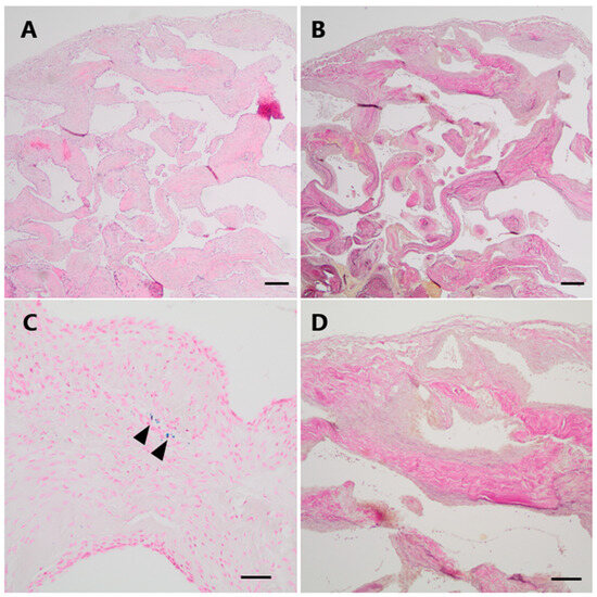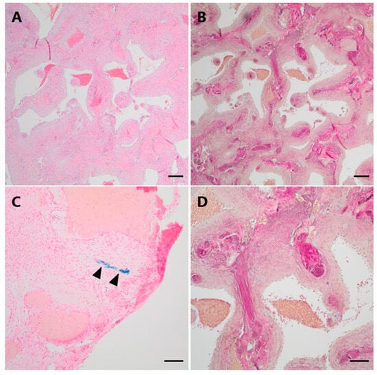 Histopathological examination of Case 2. (A) Histological examination revealed a vascular lesion with numerous dilated and thick-walled blood vessels (H&E). (B,D (higher magnification)) An EvG staning demonstrates the venous differentiation with loosely layered elastic fibers but no distinct elastic internal membrane. (C) Only focally, very low amounts of hemosiderin indicating minor leakage of blood could be visualized by a Perls Prussian blue staining (arrowheads). Scale bars: (A,B): 200 μm; (C,D): 100 μm; H&E: hematoxylin and eosin, EvG: van Gieson’s elastica.