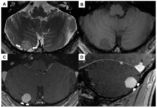 Preoperative magnetic resonance imaging of Case 2: The venous hemangioma showed a slightly hyperintense signal in the T2-weighted sequence (A), hypointense signal in the unenhanced T1-weighted sequence (B), and distinct contrast enhancement (C,D). Perifocal cerebrospinal fluid (arrows in (A)) and broad dural contact (asterisk in (A), arrowheads in (C,D)) proved the extra-axial location.