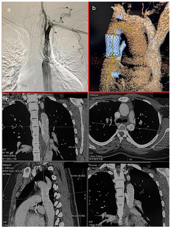 (a) Preoperative angiography of coarctation, (b) postoperative 3D CT imaging of aortic graft and chimney ARSA stent, (c) postoperative CT imaging of aortic graft and chimney ARSA stent.