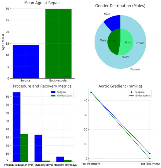 In the top-left chart, the mean age at repair was significantly higher in the endovascular group (29.82 years) compared to the surgical group (14.33 years), indicating that endovascular treatments are more commonly performed in older patients. The top-right chart shows gender distribution, highlighting a greater proportion of males in the endovascular group (47%) compared to the surgical group (11.5%). This suggests a gender disparity, with males more frequently undergoing endovascular procedures. The bottom-left bar chart compares procedure duration, ICU stay, and hospital stay. The endovascular group showed shorter procedure durations (34.06 min vs. 85.21 min), ICU stays (1.53 h vs. 33.27 h), and hospital stays (2.29 days vs. 6.38 days), highlighting the less invasive and quicker recovery nature of endovascular treatment. Finally, the bottom-right line graph illustrates aortic gradient reduction. Both groups showed a significant decrease in aortic gradient post treatment, with the endovascular group achieving complete resolution (0 mmHg), and the surgical group showing a residual gradient (3.46 mmHg), suggesting superior immediate hemodynamic outcomes with endovascular procedures.